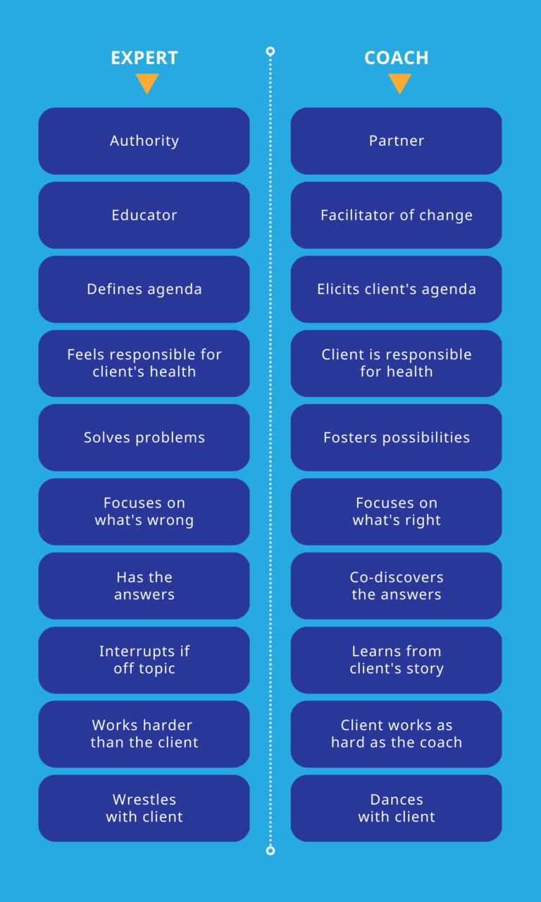 Coaches look to collaborate and partner rather than showing up as experts who primarily analyze problems, give advice, prescribe solutions, recommend goals or provide education. Coaches take off the expert hat and refrain from an expert approach, to empower their clients to find their own answers to catalyze lasting change.