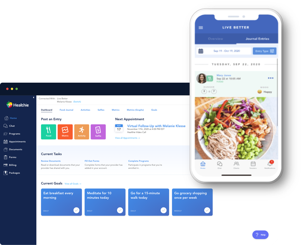 Client engagement tools and mobile app access available for clients through Healthie Portal.